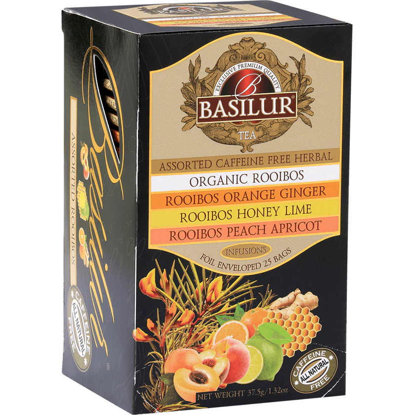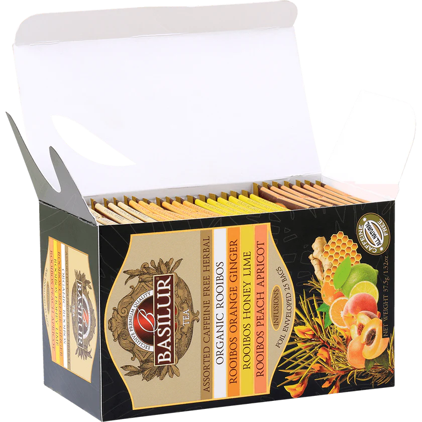 Los beneficios para la salud del té rooibos rojo incluyen su uso como una cura para dolores de cabeza, insomnio, asma, eccema, debilidad ósea, hipertensión, alergias y envejecimiento prematuro. Este té es absolutamente libre de contenido de cafeína y también es bajo en taninos. Beberlo puede aliviar los calambres estomacales severos, así como aliviar el asma y otras afecciones relacionadas. También aumenta el sistema inmunológico.oibos Durazno & Damasco