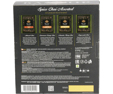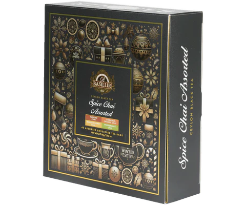 Te Basilur Negro Spice Chai Assorted Caja 40 Bolsas Sumérgete en la calidez de Ceilán. El exclusivo set de té Basilur Spice Chai es la pieza central perfecta para tus tardes de invierno. Una cuidada selección de Tés Negros de Ceilán Premium se fusiona con especias aromáticas y notas naturales para crear una experiencia de sabor inolvidable. Presentado en un elegante y festivo envase, este set no es solo una colección de tés, es el ritual que convierte tu hogar en un refugio mágico. Descubre los 4 Viajes de Sabor:
