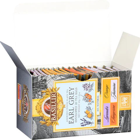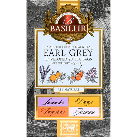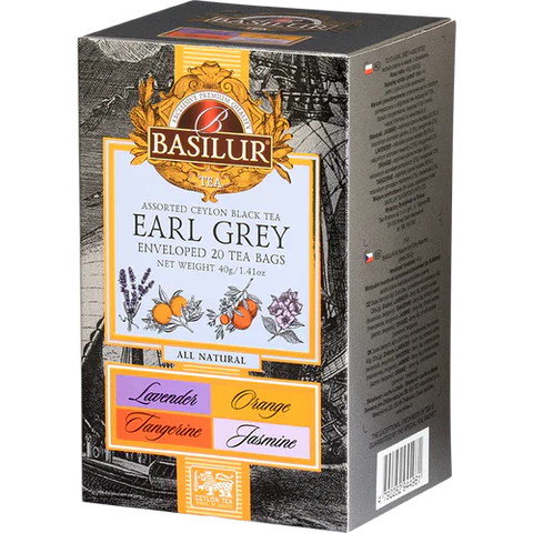 Ingredientes: Lavanda: Té negro de Ceilán (95,5%) con adición de aroma natural de lavanda (2,5%) y bergamota (2,5%). Jazmín: Té negro de Ceilán (95,5%) con adición de sabor natural de jazmín (2,5%) y bergamota (2,5%). Naranja: Té negro de Ceilán (96%) con adición de sabor natural de naranja (2%) y bergamota (2%). Mandarina: Té negro de Ceilán (96%) con aroma natural de mandarina (2%) y bergamota (2%).